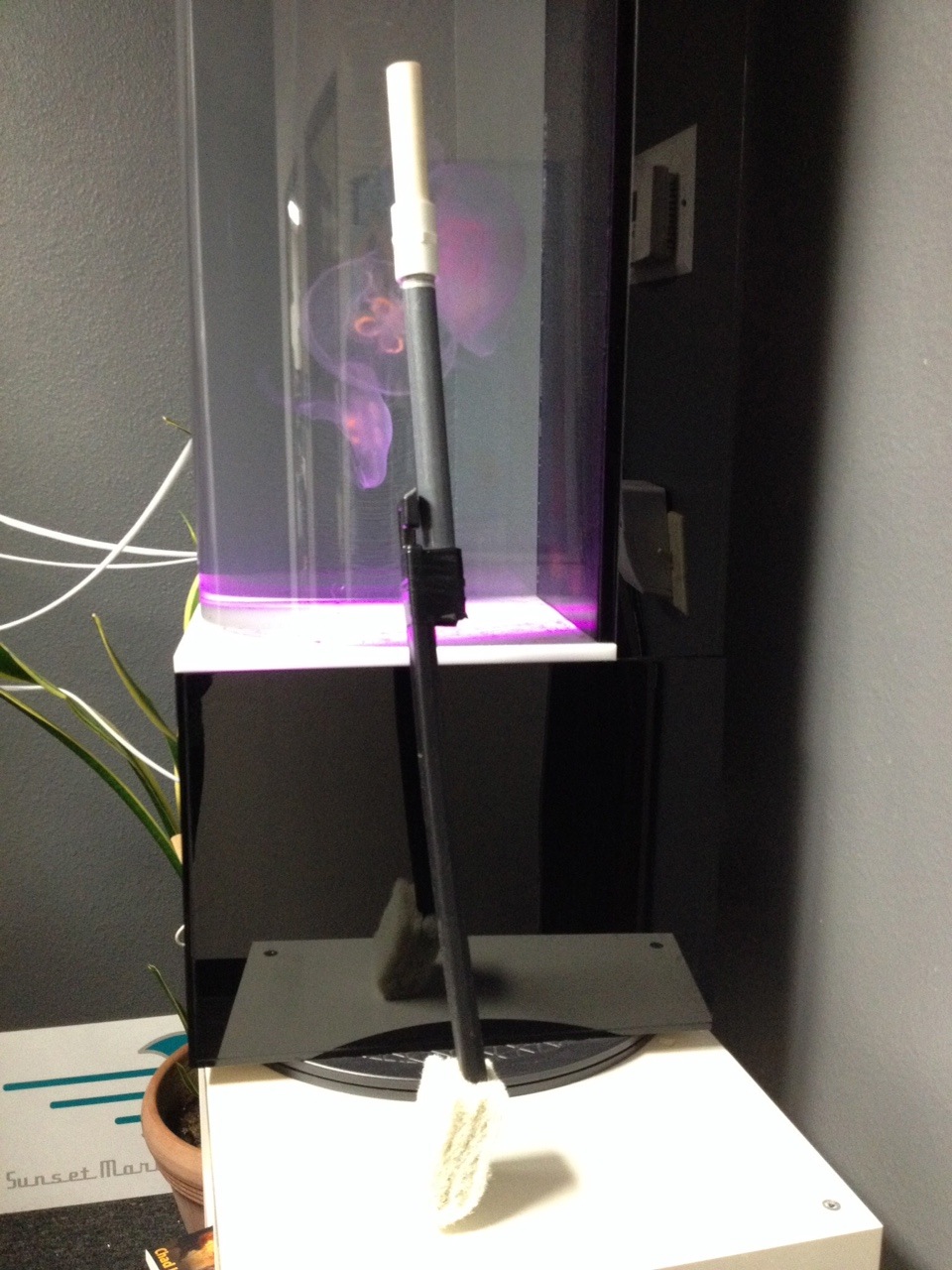 If you have the Eon 20 gallon Jellyfish System, you may have had difficulty cleaning the bottom of the tank. It’s easy to clean the sides of the tank with an aquarium cleaning magnet, but how to clean the bottom & back? There are some extension scrubber brushes out there (the black unit on the left in the picture), but in our experience these tend to be in adequate. They do extend nicely but…..